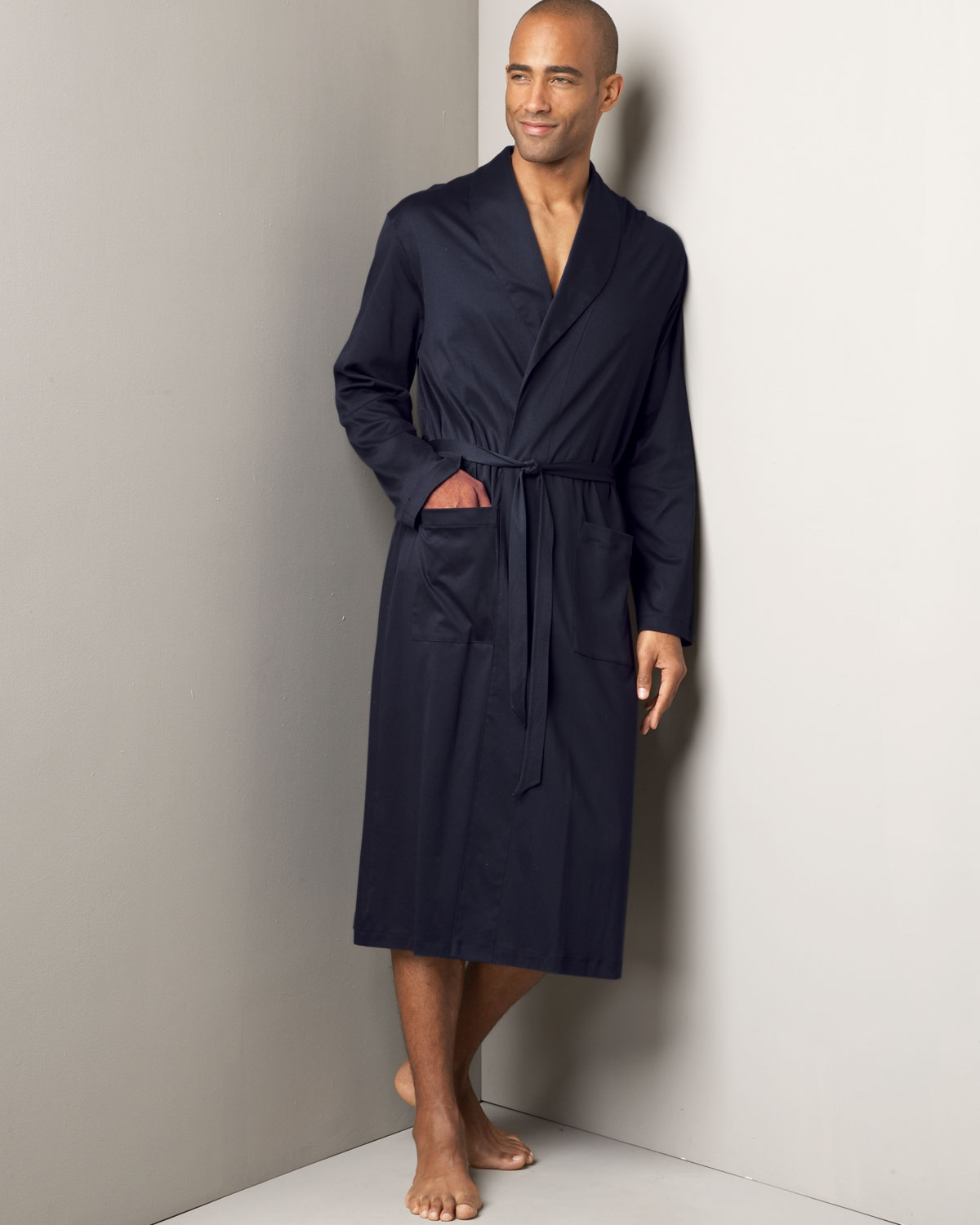 Deep blue. Shawl collar; tie waist. Long sleeves. Patch pockets at hip. Mercerized cotton. Imported.
